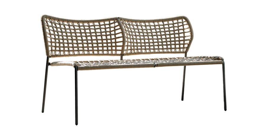 Bench with handwoven seat and back on a steel frame. Suitable for both indoor and outdoor use. Wide weave.