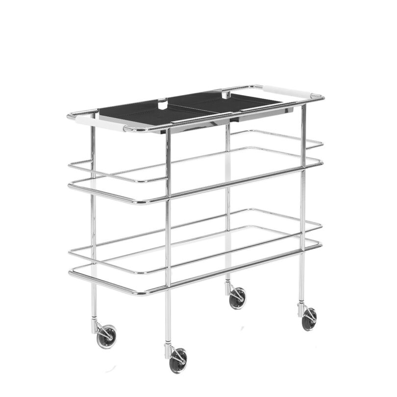 70cm / 28″ trolley in epoxy painted finish or chrome. 2 x laminate lower shelves. 2 x stainless steel top shelves with black rubber mat.