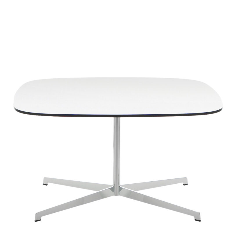18″ high table with Epoxy painted frame or Chrome. 100cm x 110cm / 40″ x 44″ top in Oak Veneer or White Compact Laminate with black edge.
