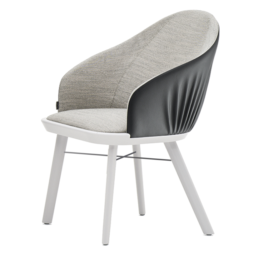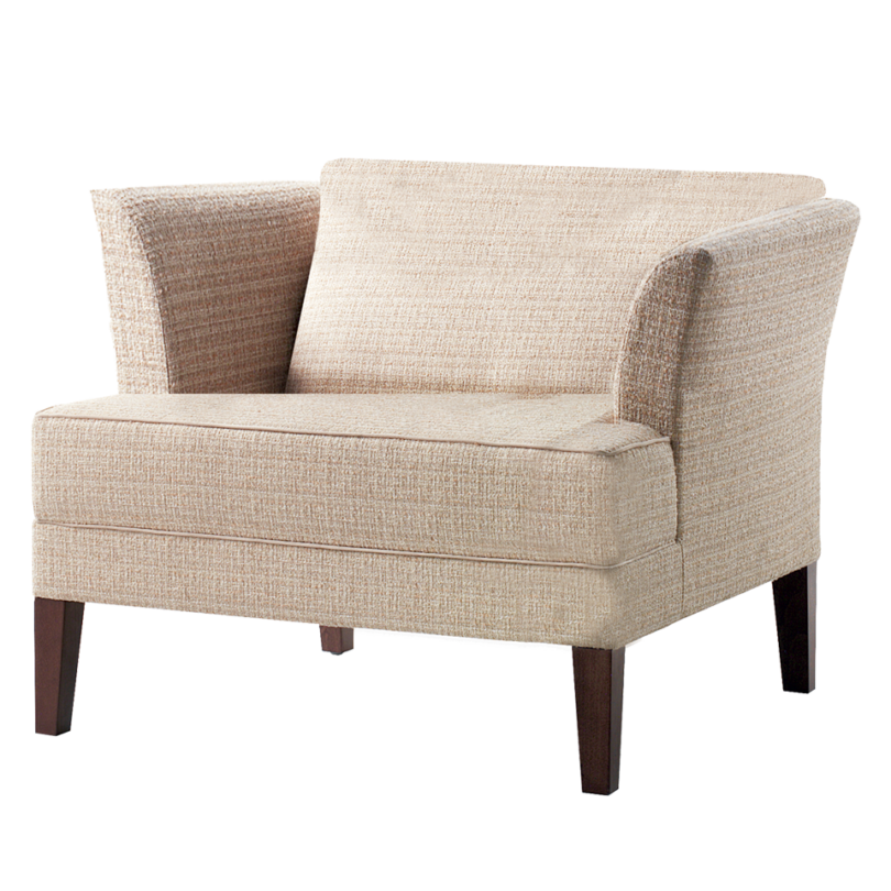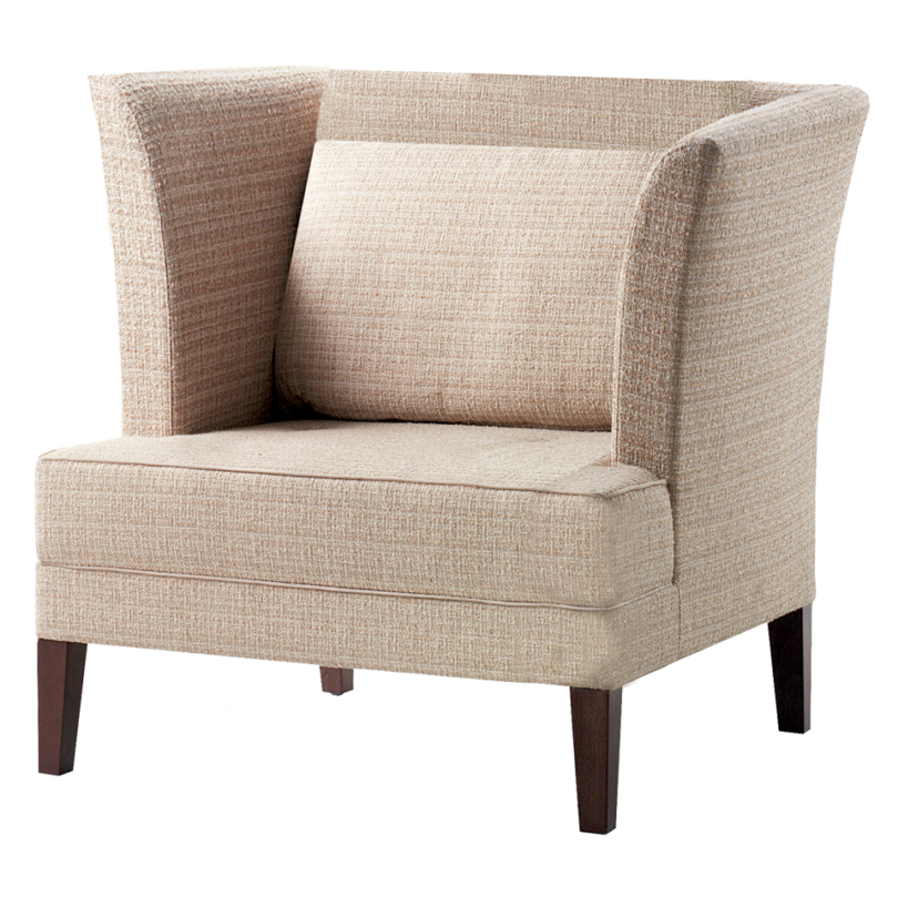 Fully upholstered lounge chair with low back and wood legs. Greenguard Certified.