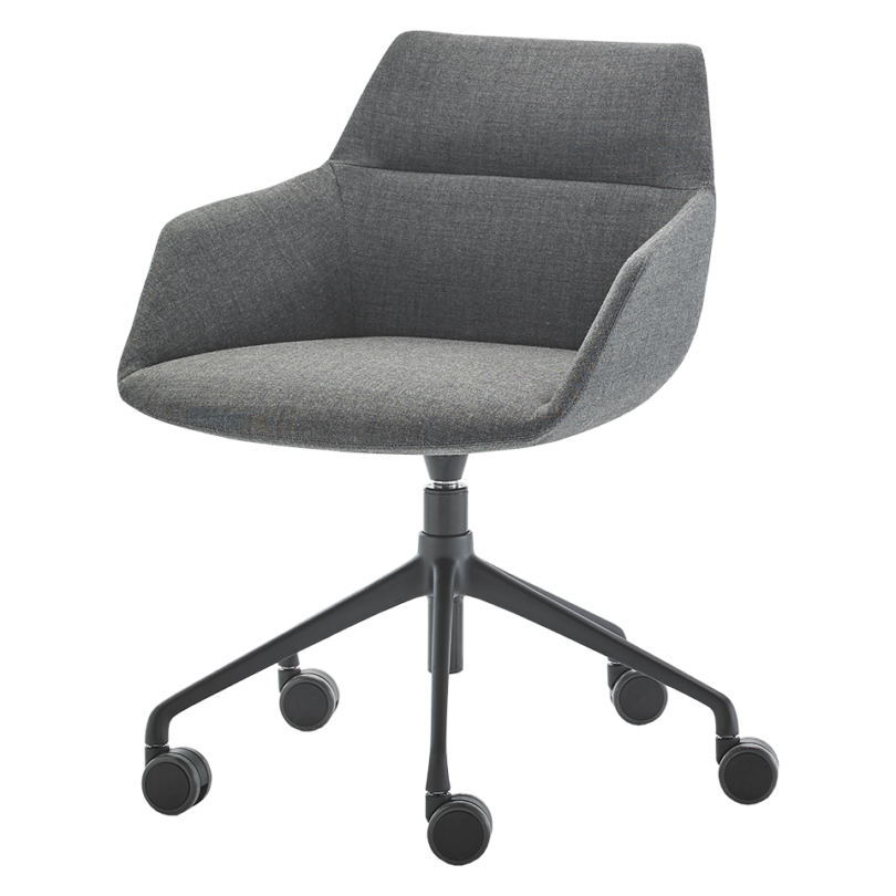 Fully upholstered chair on a 5-spoke aluminium base, with casters. Height adjustable, 360° swivel seat with no return mechanism. Greenguard Gold-certified to protect indoor air quality.