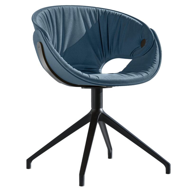 Side chair with extra cushioned upholstered shell on a four spoke column base in black lacquered steel with PVC glides. The frame has a 360° swivel mechanism without memory return. The shell elements are secured to the frame with innovative steel fixings.