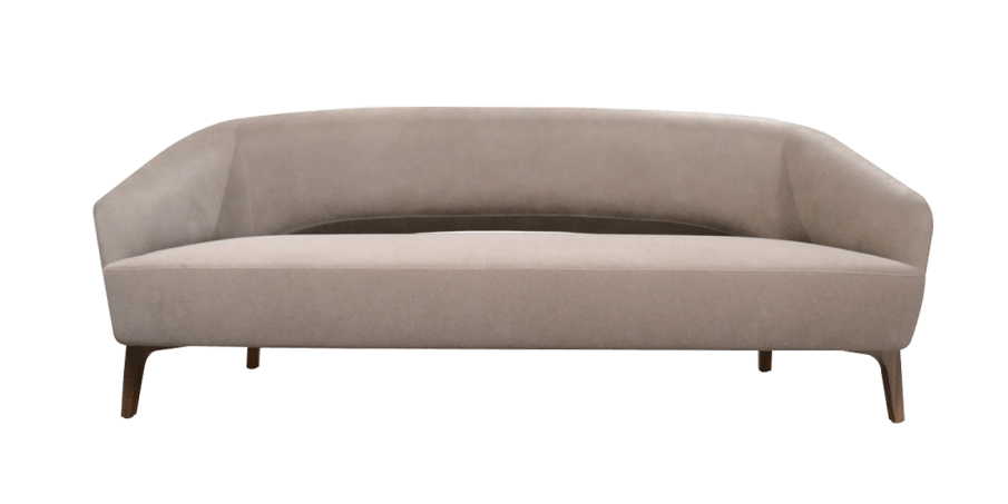 Fully upholstered double-sided sofa with aluminum colored plastic feet.