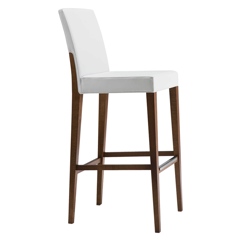 Counterstool with solid wood frame. Upholstered seat and back. Special wooden detail for easy cleaning (crumb tray).