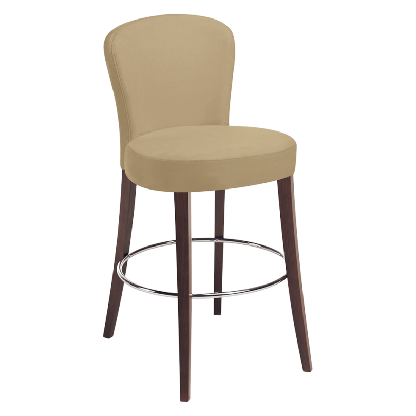 Upholstered bar stool with beech frame. With kickplates in brushed stainless steel