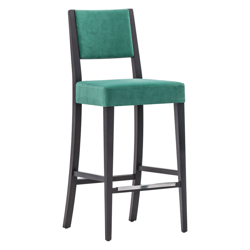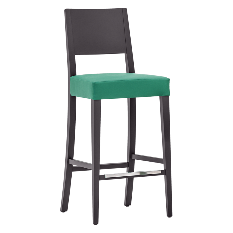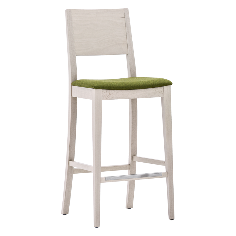 Counter stool with beech frame, upholstered seat and wood back. Wood seats available upon requests. With kickplates.
