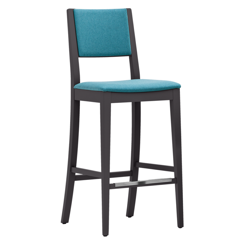 Barstool with beech frame, upholstered seat and inside back. With kickplates.