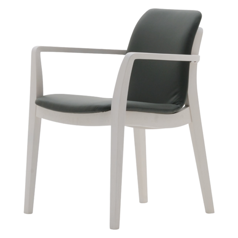Armchair with upholstered seat on 4 legged wood frame. Polypropylene outside back with matt finish, padded-effect texture.