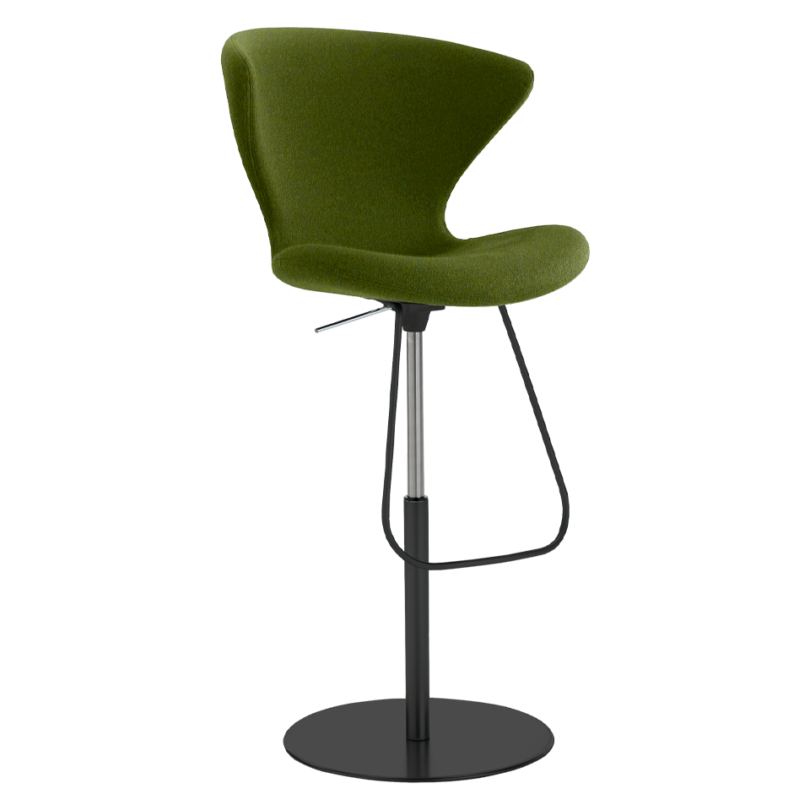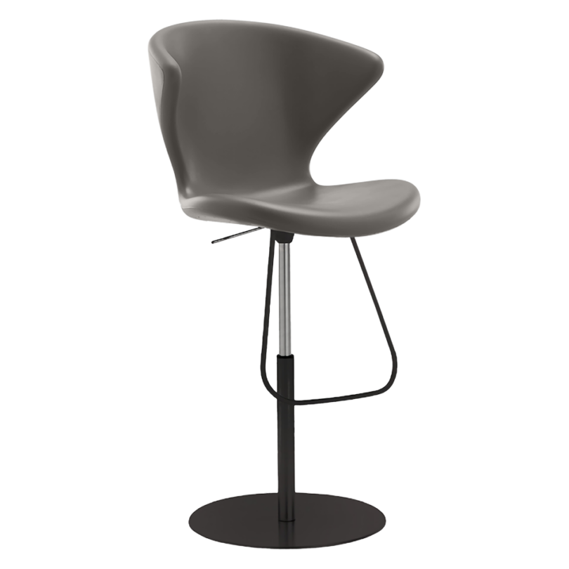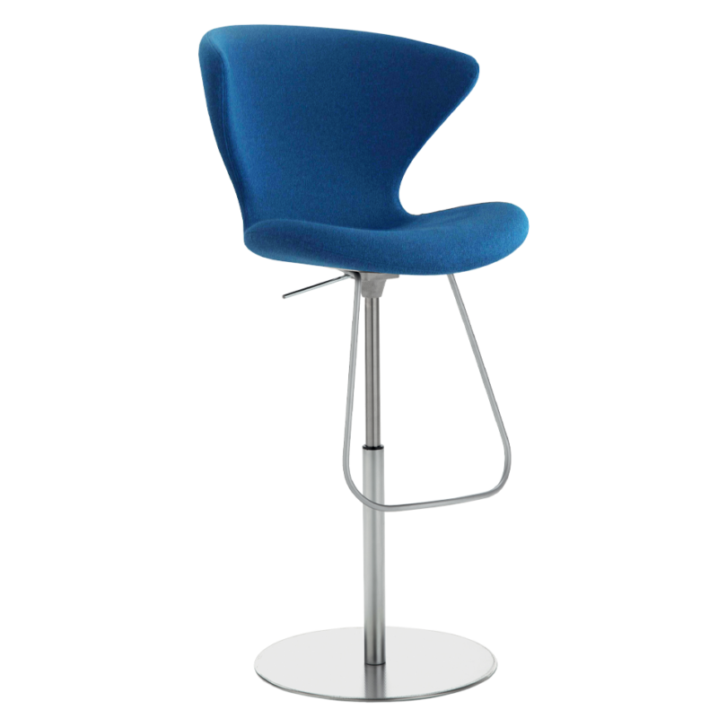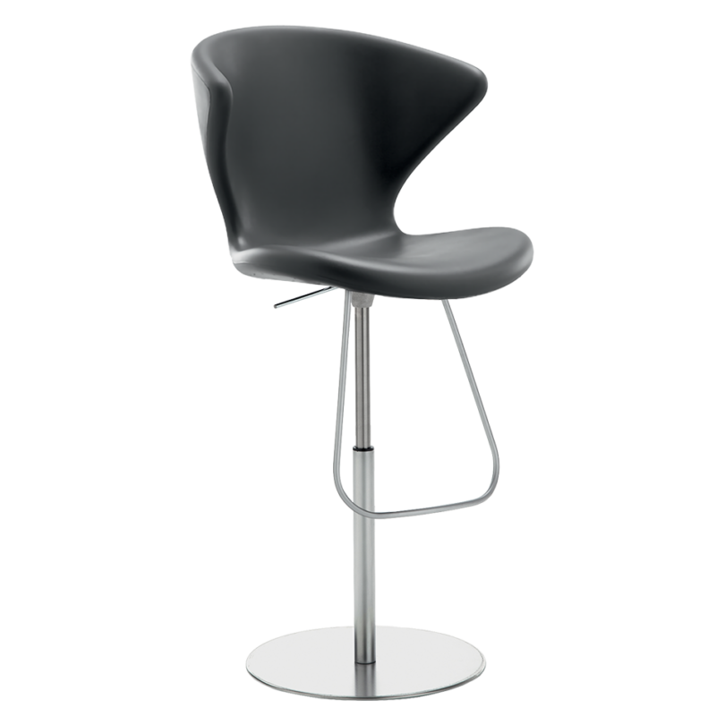 360 degree swivel barstool with adjustable height. Matt lacquered steel pedestal base and footrest with upholstered shell.