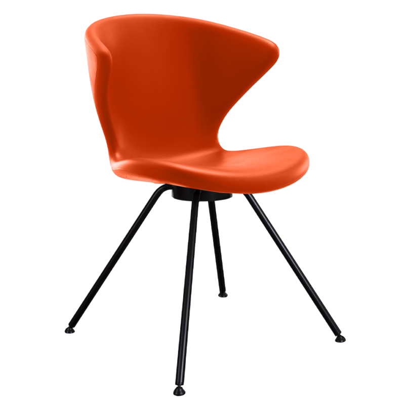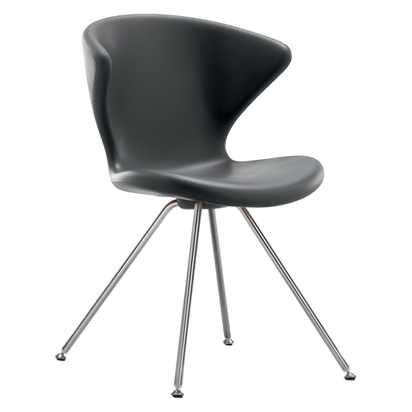 360 degree swivel chair with memory return. Polished chrome, matt chrome or lacquered steel legs with soft touch injected foam shell.