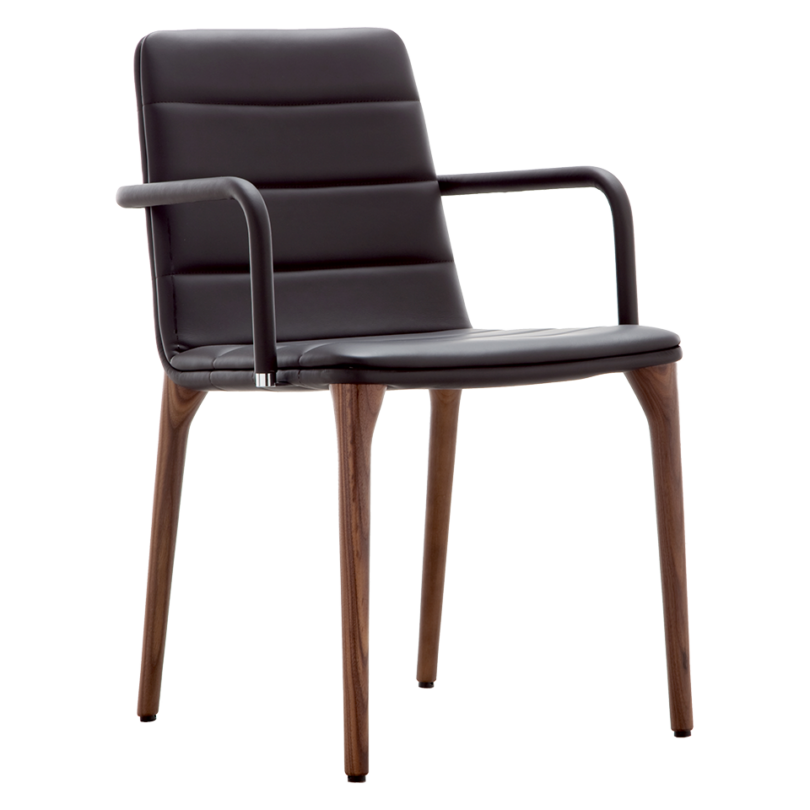 Arm chair in modern design, upholstered with fine stitching. Outside back and legs in oak or walnut.