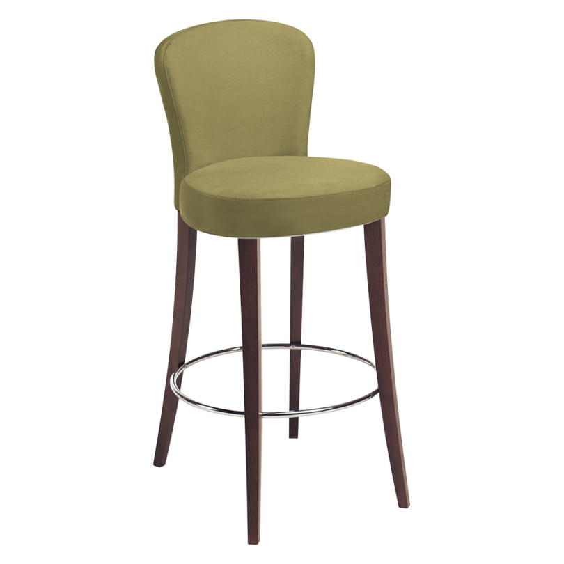 Barstool with beech frame, seat and back upholstered. Footrest in chrome. With kickplates.