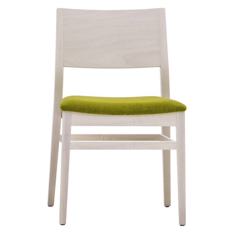 Side chair in beech with upholstered seat and inside back. Stacks 5.