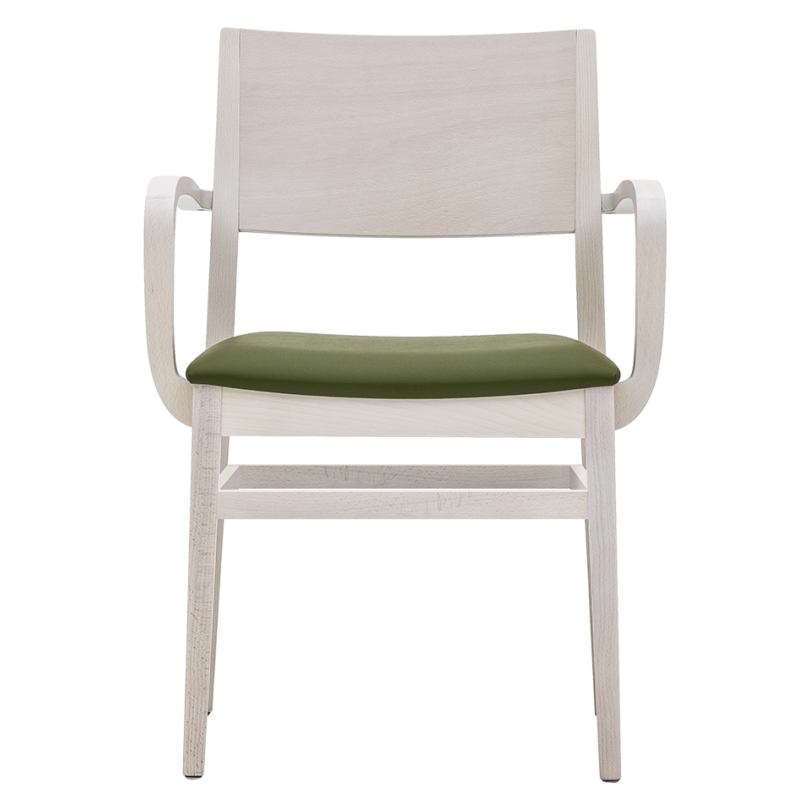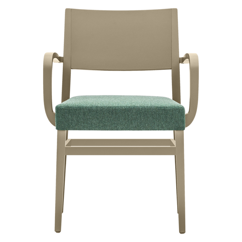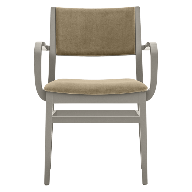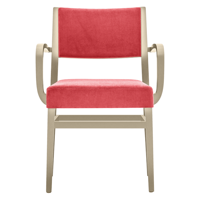 Armchair (narrow version) with beech frame and stretchers. Seat, back and arms upholstered. MOQ 100 pieces.