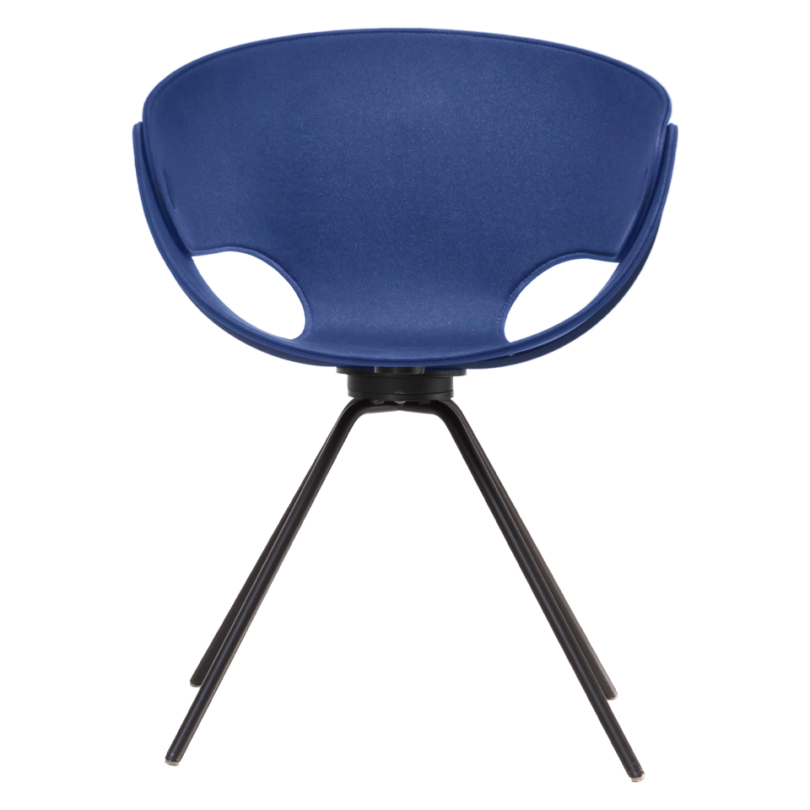 Armchair with a flexible padded seat suspended on a lacquered black matte fixed base. The shell elements are secured to the frame with innovative steel fixings.