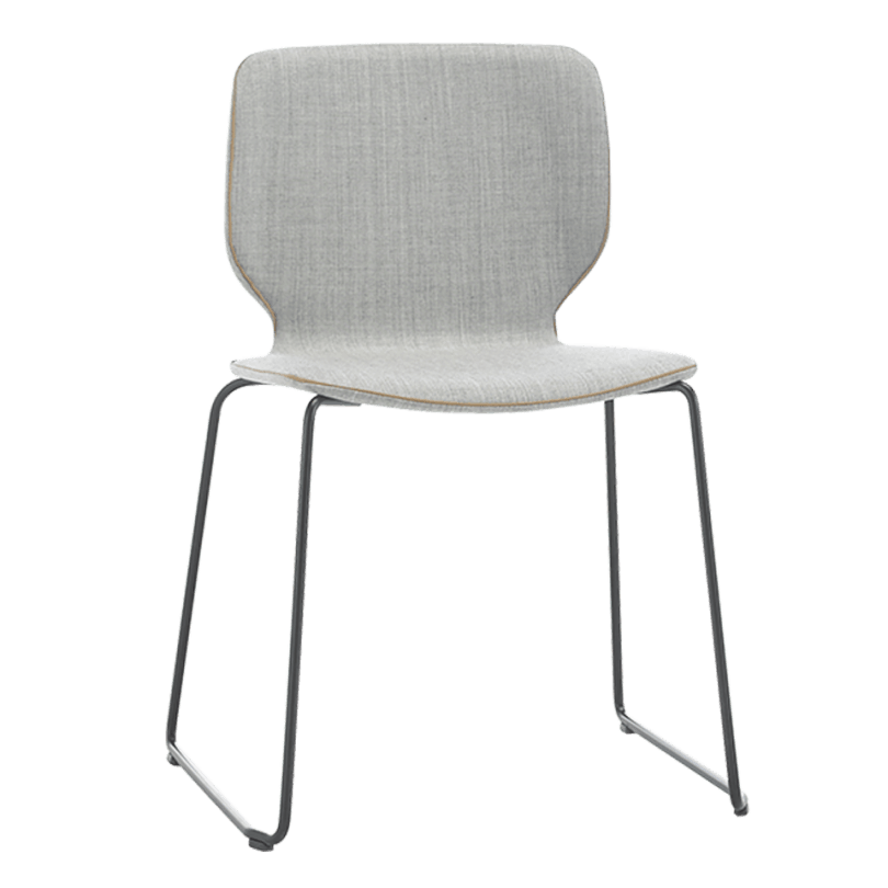 Upholstered side chair with a steel sled base. Stacks 6 on floor, 10 on a dolly. Greenguard Certified.