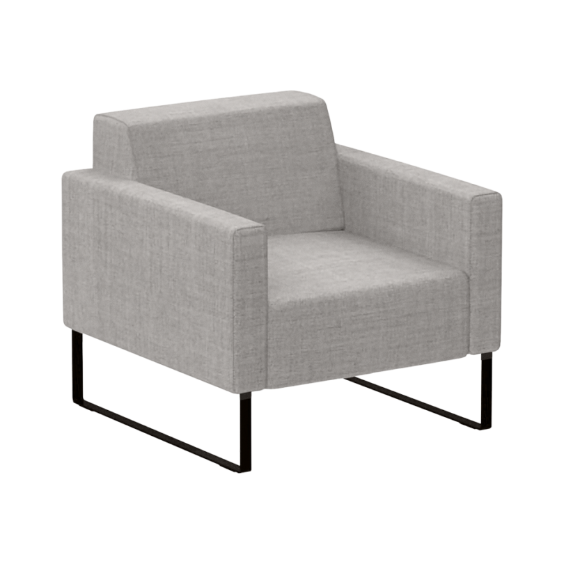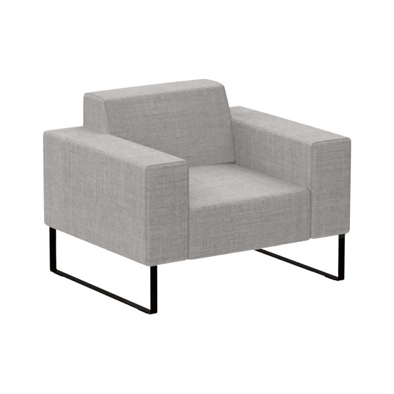 Upholstered armchair W 31.5″ with arms W 4″ and steel plate legs.