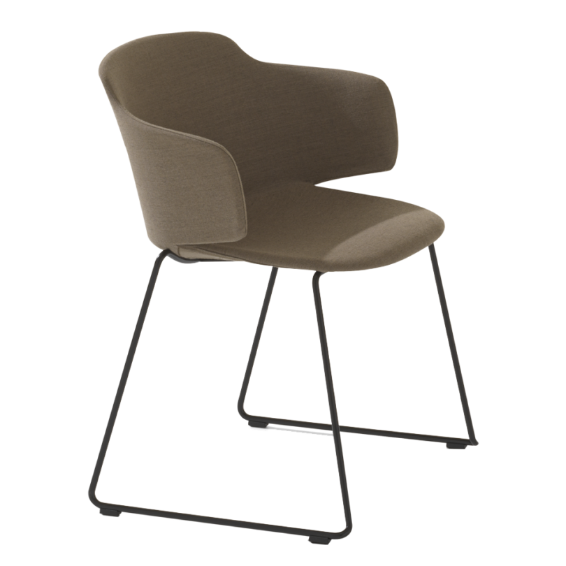 Armchair with solid-colored integral foam shell foam shell on Lacquered steel sled base.