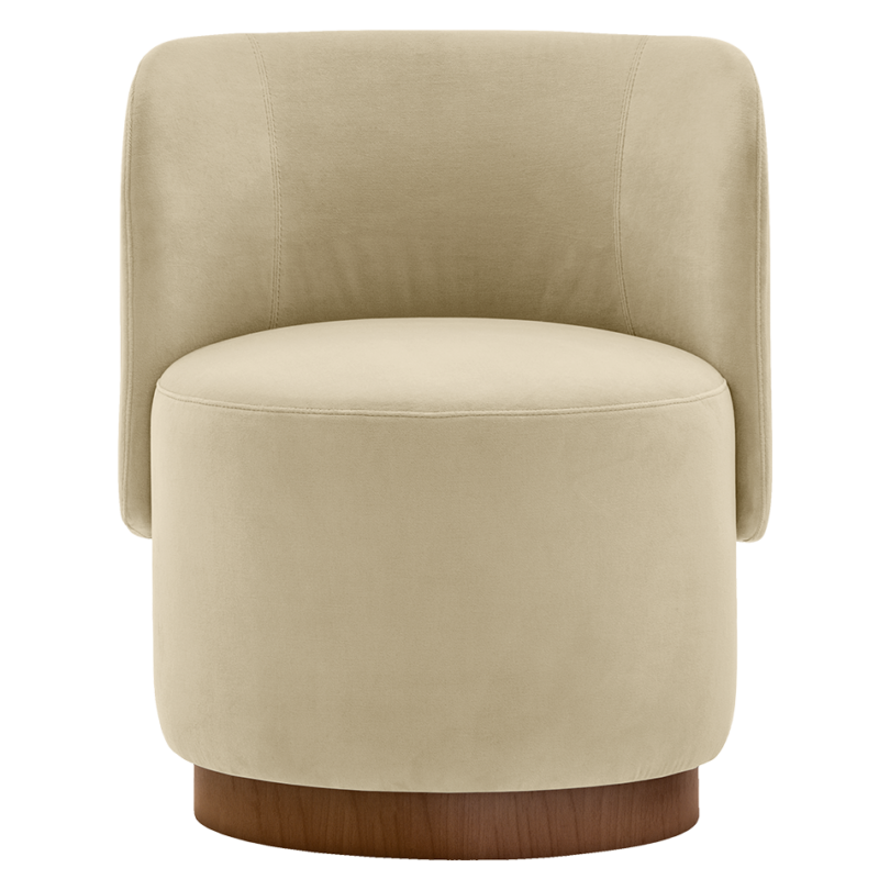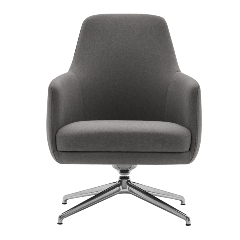 Upholstered armchair with low backrest and round steel tube 4 leg frame.