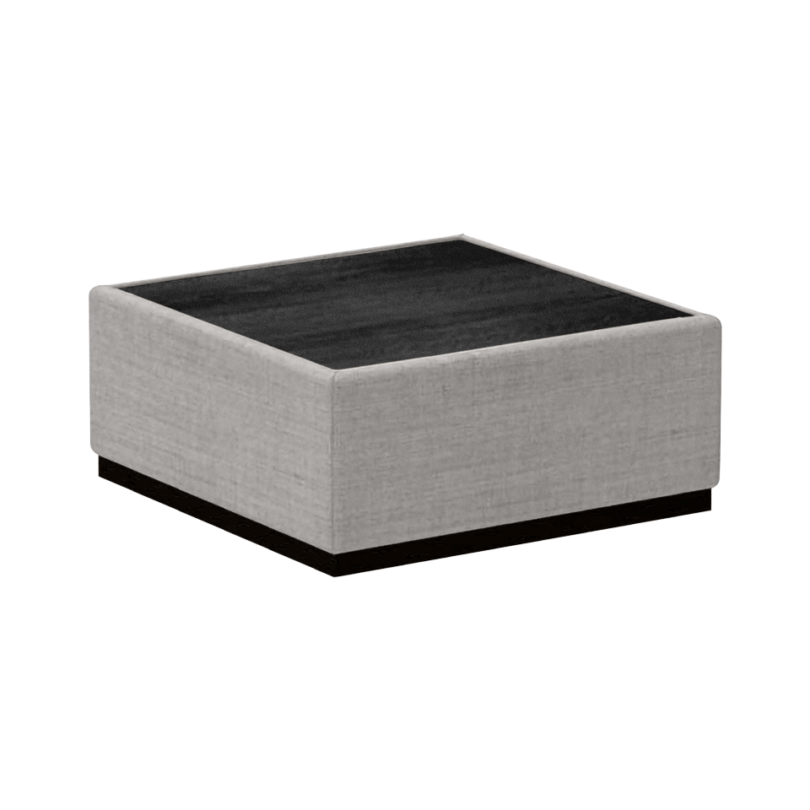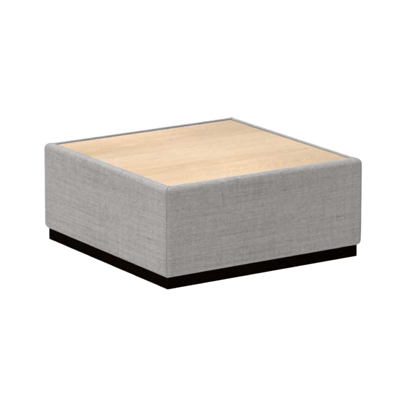 Upholstered modular table measuring 80x80cm with oak tabletop, suitable for lounge areas.