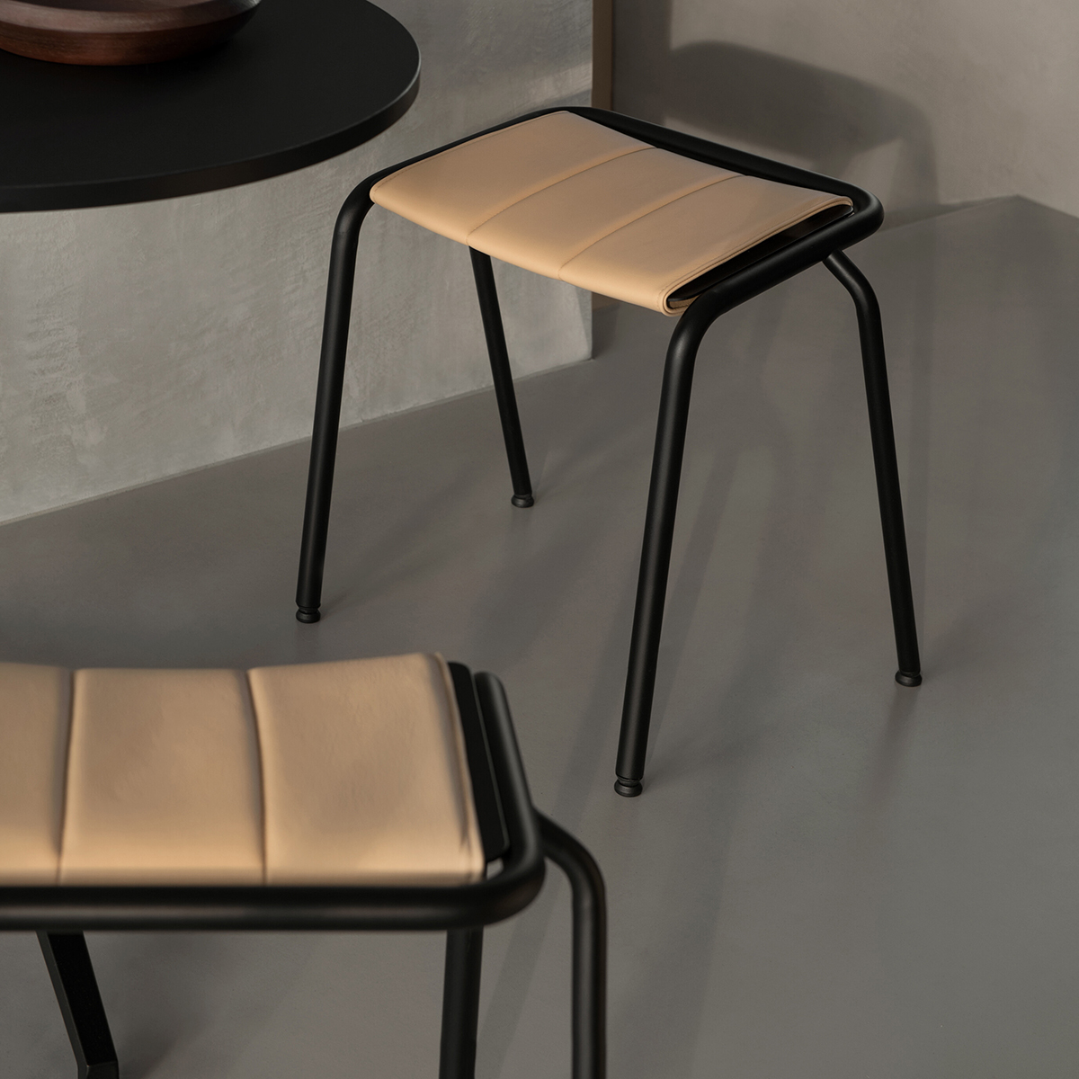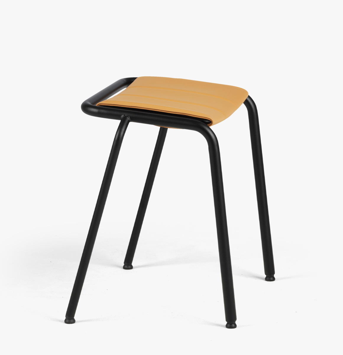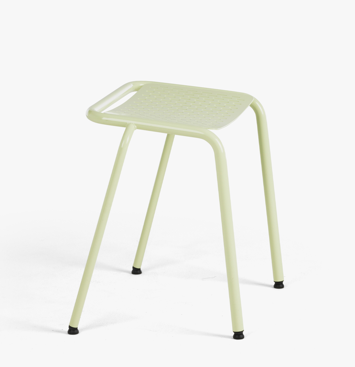 Frame of Ø 25 & 20 mm powder coated steel tube. Seat of 3mm perforated sheet steel. Loose reversible cushion as an option. Glides. Stackable.