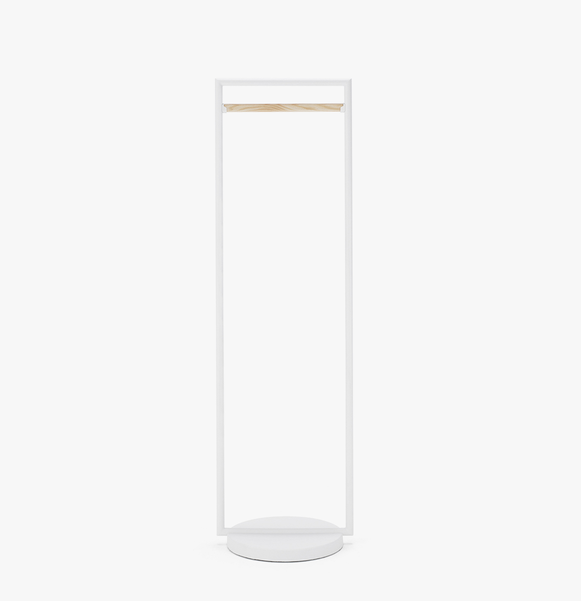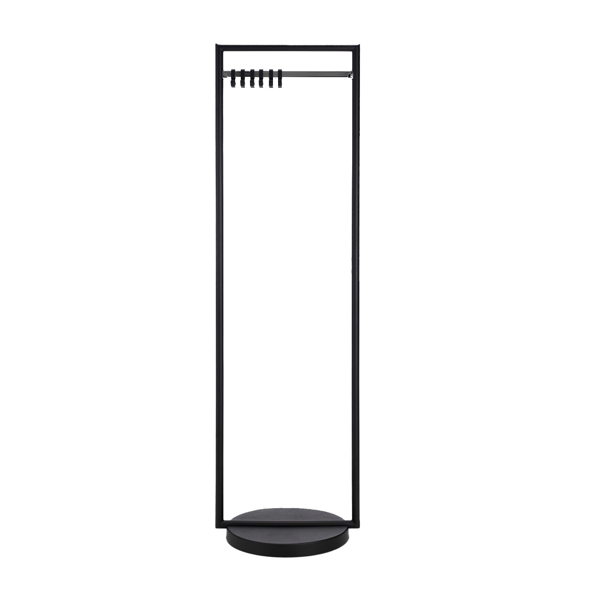 Coat hanger with foot plate in texture powder coated casted iron, adjustable feet and a frame of 28mm powder coated steel tubing.