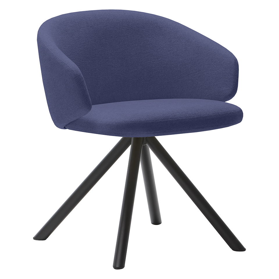 Upholstered armchair with low backrest and 4 spoke swivel base in round steel tube. The seat height is not adjustable.