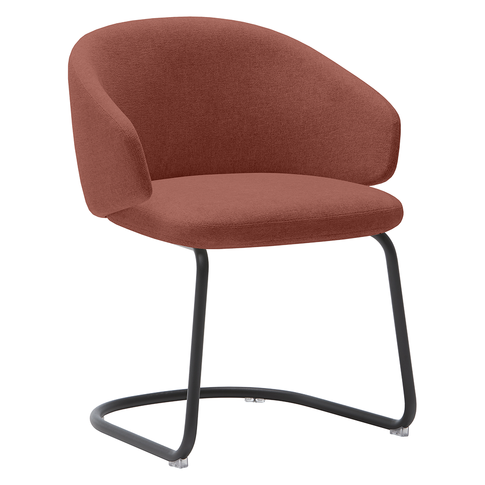Upholstered armchair with low backrest and round steel tube cantilever base.
