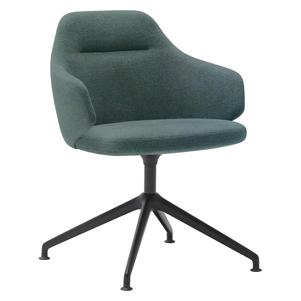 Upholstered armchair with medium backrest and 4 spoke swivel aluminum base. The seat height is not adjustable.