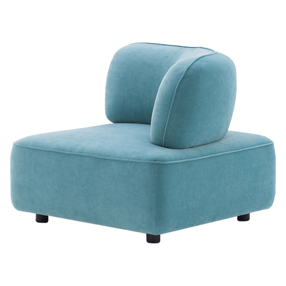 Square sofa module with curved right back, solid wood structure, variable density foam. Webbed seat. Feet in black nylon.