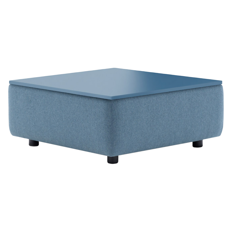 Square coffee table with black nylon legs and solid wood frame and lacquered MDF top. Feet in black nylon.