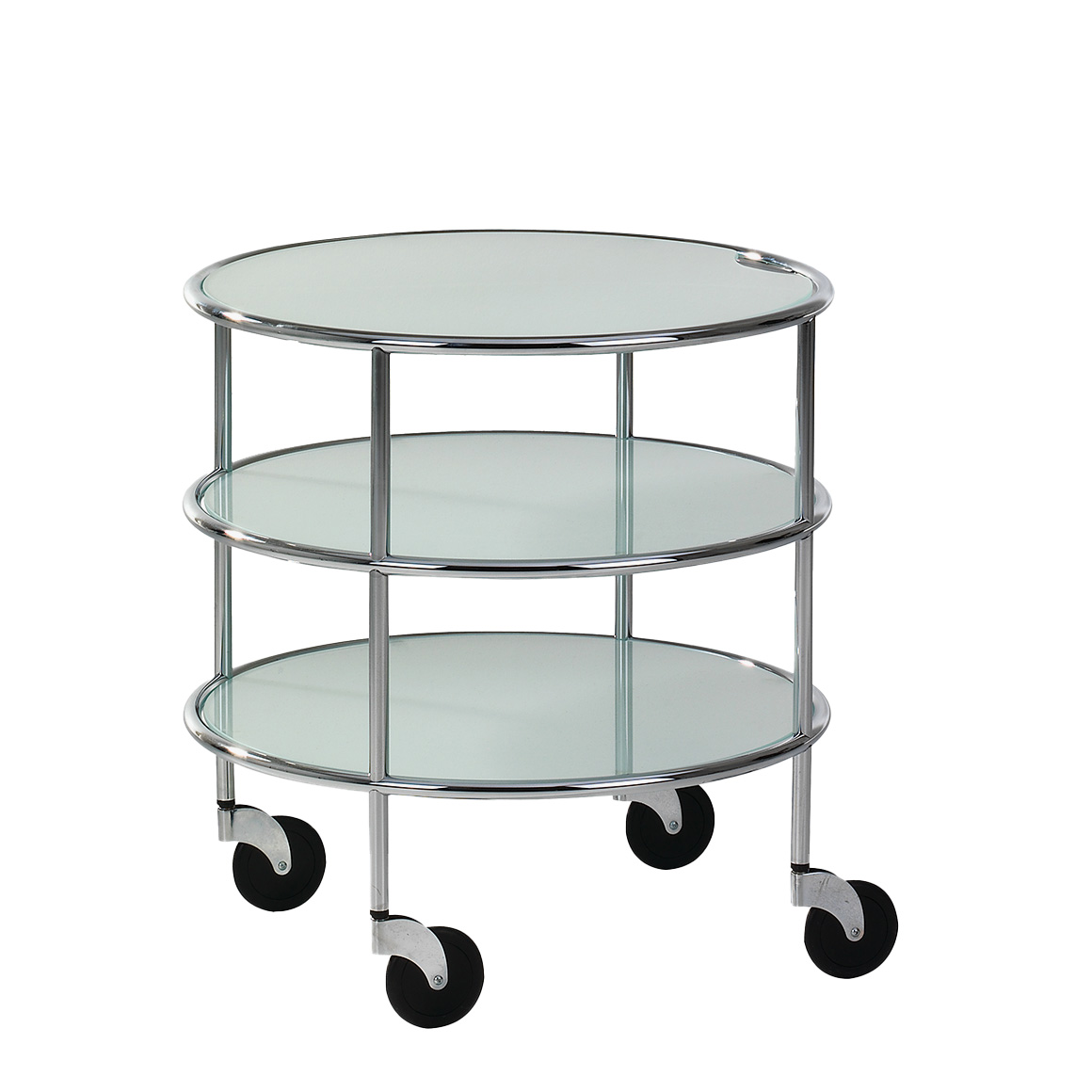 Trolley with powder coated or chrome frame and shelves in frosted glass.