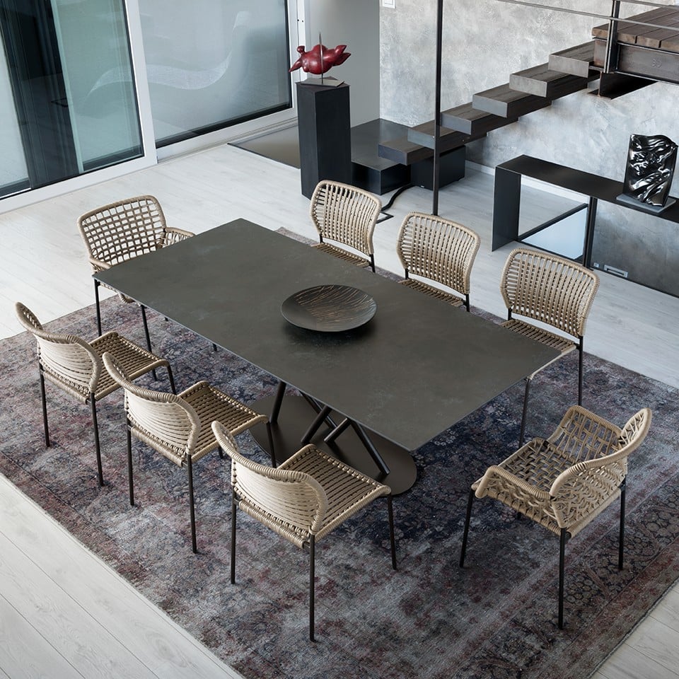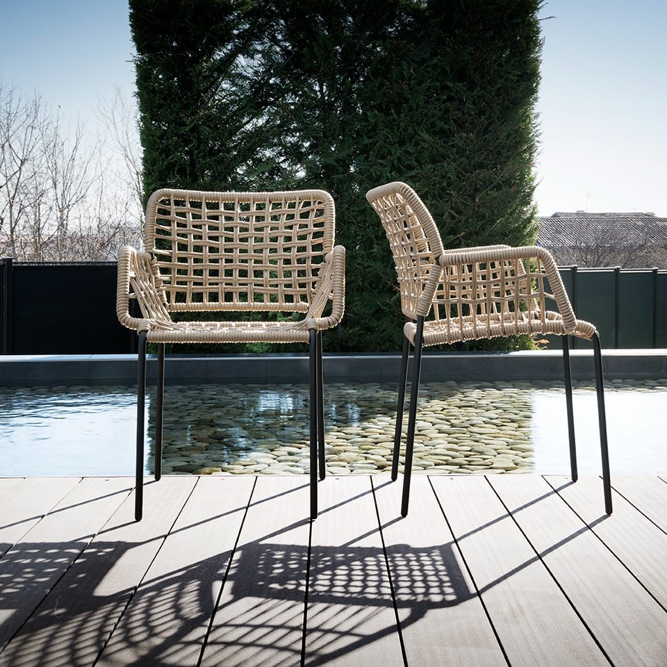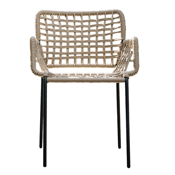 Armchair with handwoven seat and back on a steel frame. Suitable for both indoor and outdoor use. Wide weave.