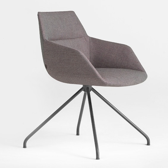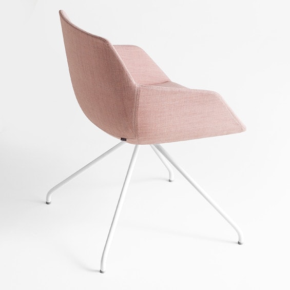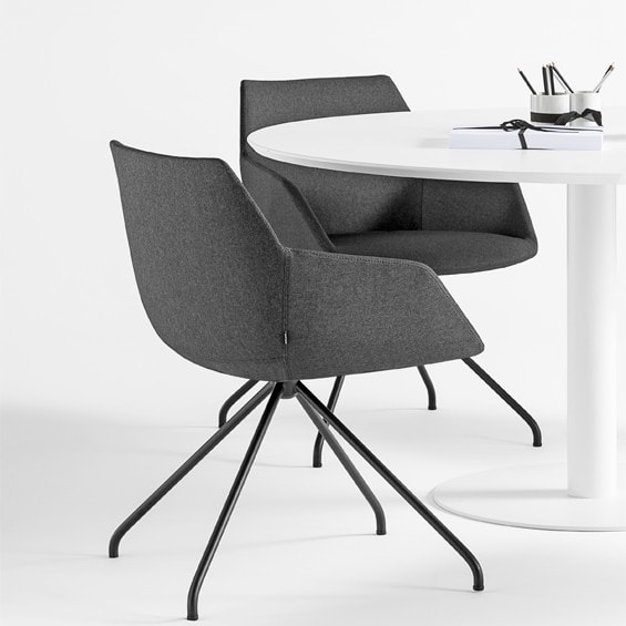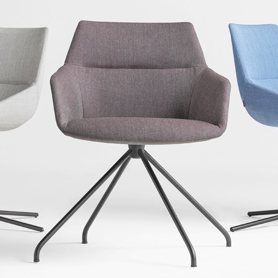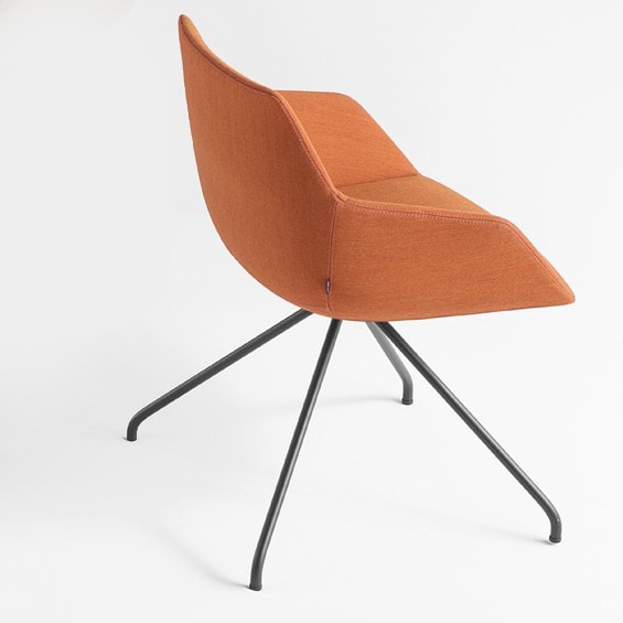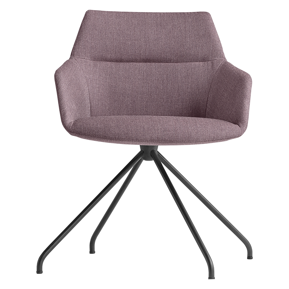 Fully upholstered side chair on trestle base. 360o swivel seat with no return mechanism. Greenguard Certified.