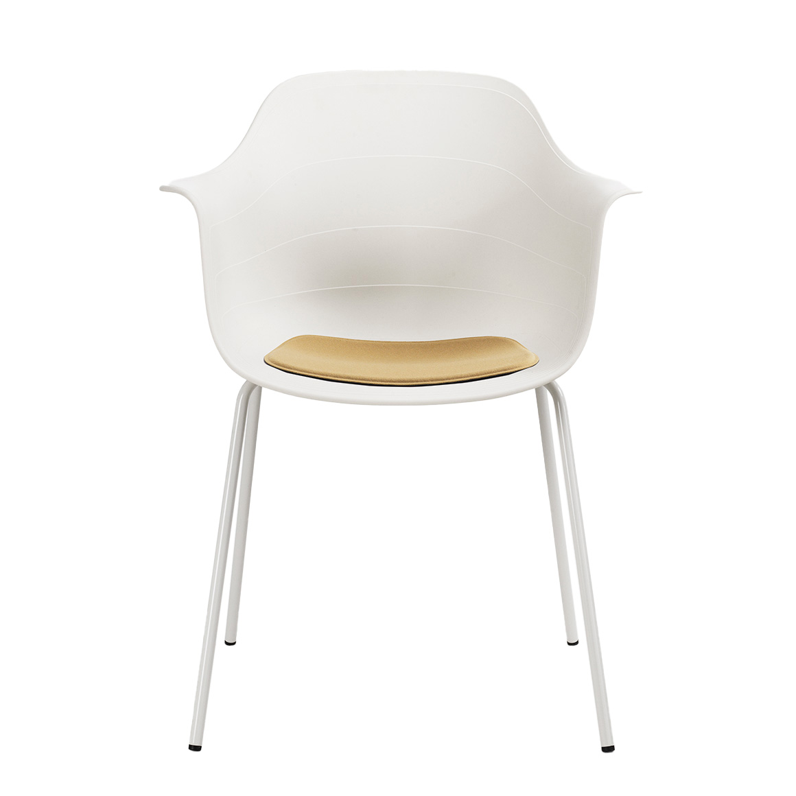 Armchair with recycled polypropylene seat on a powder coated or chromium plated tubular steel frame with upholstered seat pad.