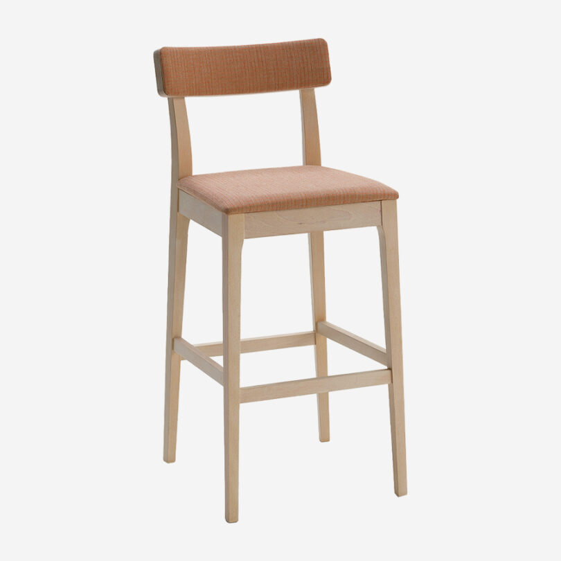 Counter stool with upholstered seat option and frame in natural beech. Produced to custom height per customer specification, from 23.5”-29” seat height. All Groove wooden stools come with front footrest as standard.