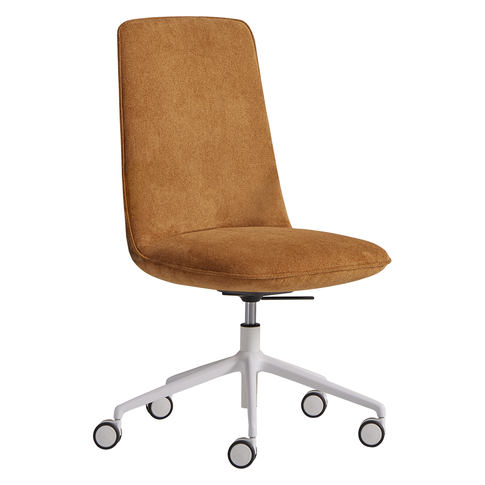 Swivel chair with medium backrest and 5 spoke cast aluminum alloy base fitted with gas lift column and tilt mechanism. SOFT TREAD casters for hard surface flooring is standard.