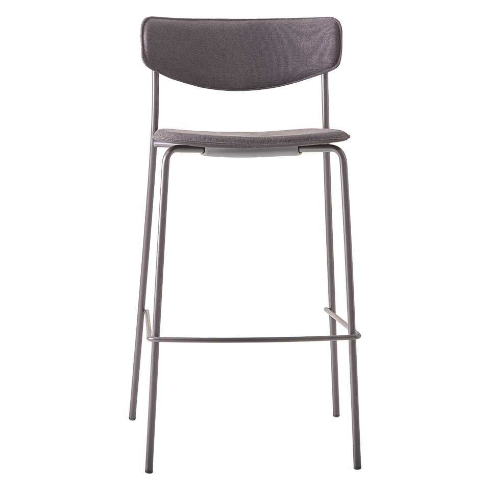 Stackable high stool with upholstered seat and back. Round steel tube four leg frame. GREENGUARD Gold Certified. ONLY AVAILABLE IN MULTIPLES OF 2 UNITS