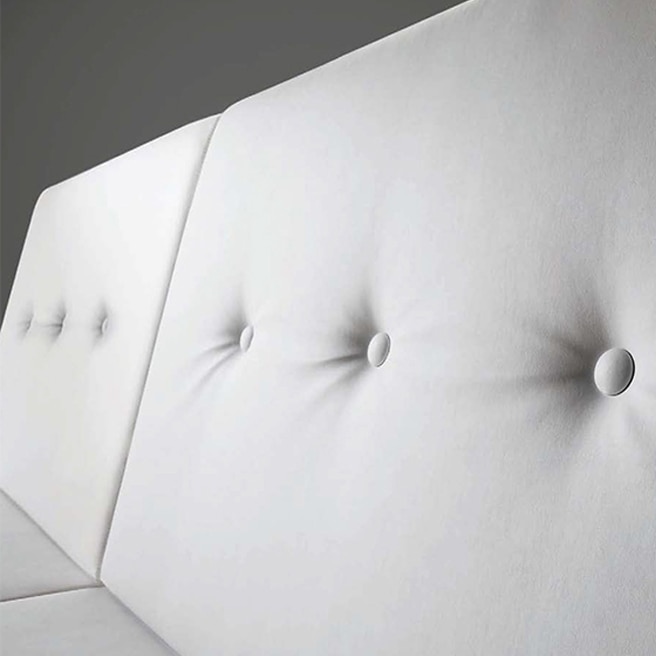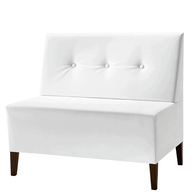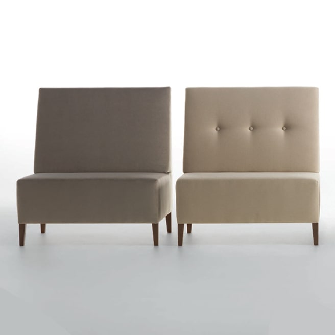 The lower version of the Linear modular bench, with solid wood legs. Unfinished rear back. Front back with button detail. Upholstered directly onto the frame with standard and customer’s own finishes available.
