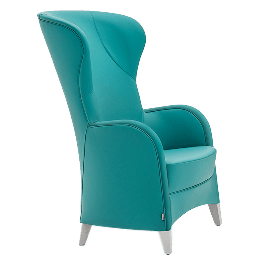 Fully upholstered high-back lounge chair with piping detail on the inside and outside of the armrests on a solid wood frame.