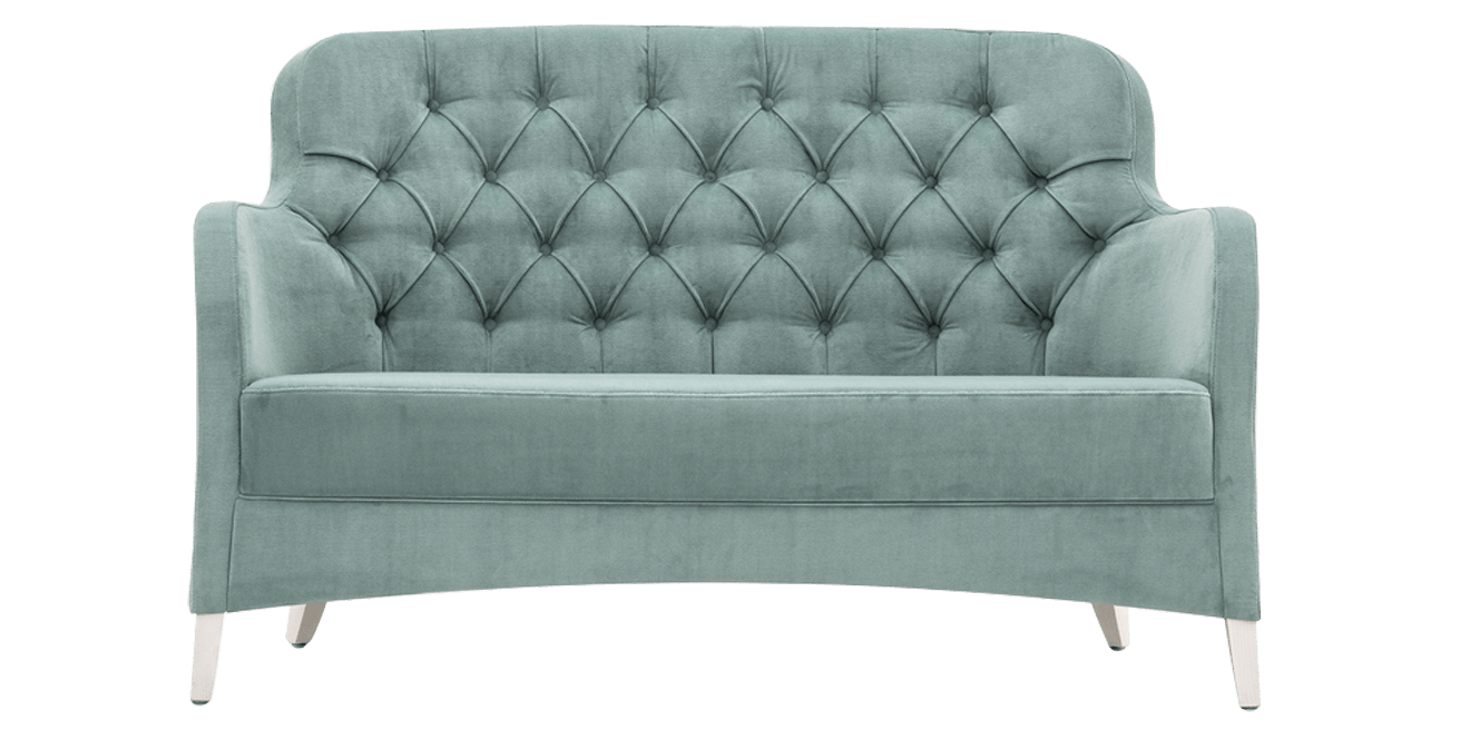 Fully upholstered two seater sofa on a solid wood frame. The front of the back has buttoned upholstery, and there is piping detail on the inside and outside of the armrests.