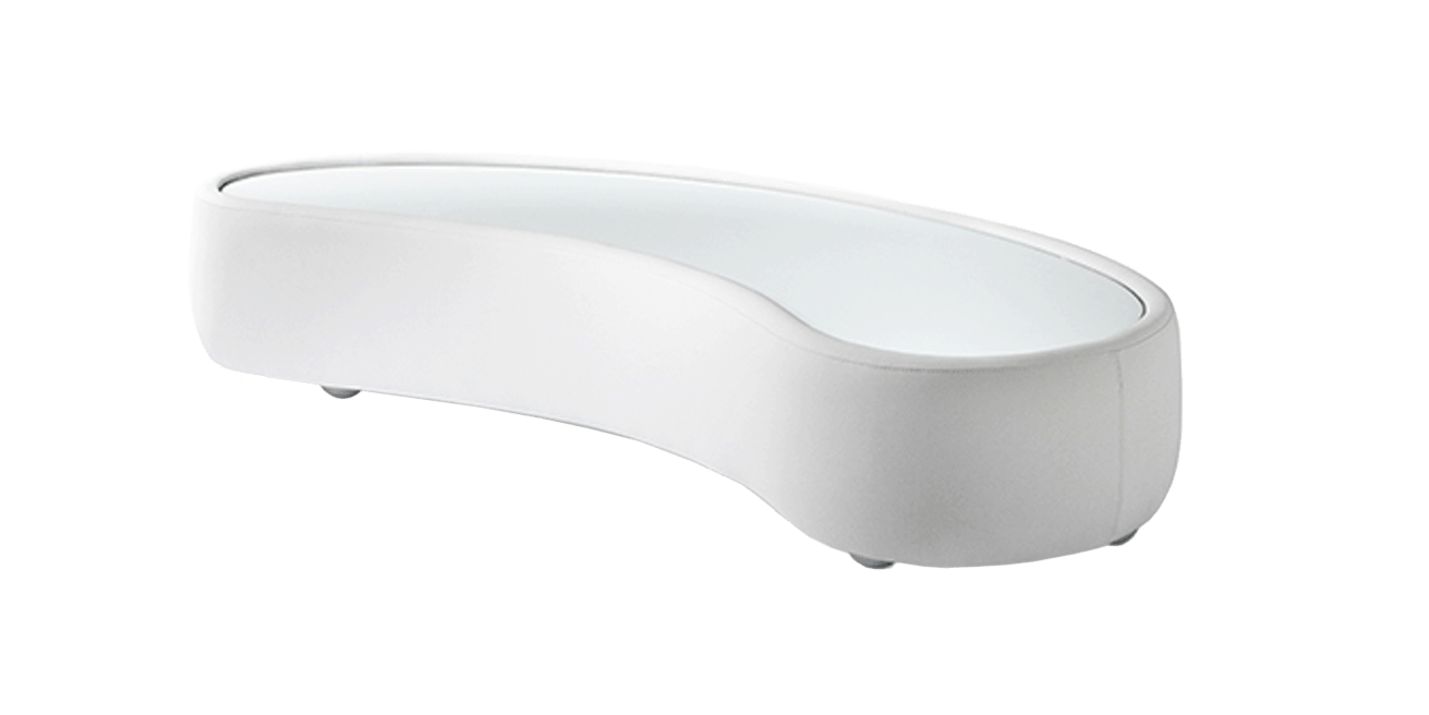 Coffee table with plywood frame. Fabric upholstered onto frame. Top in transparent, tempered glass. With rounded black colored plastic feet. This product has an extended lead time.