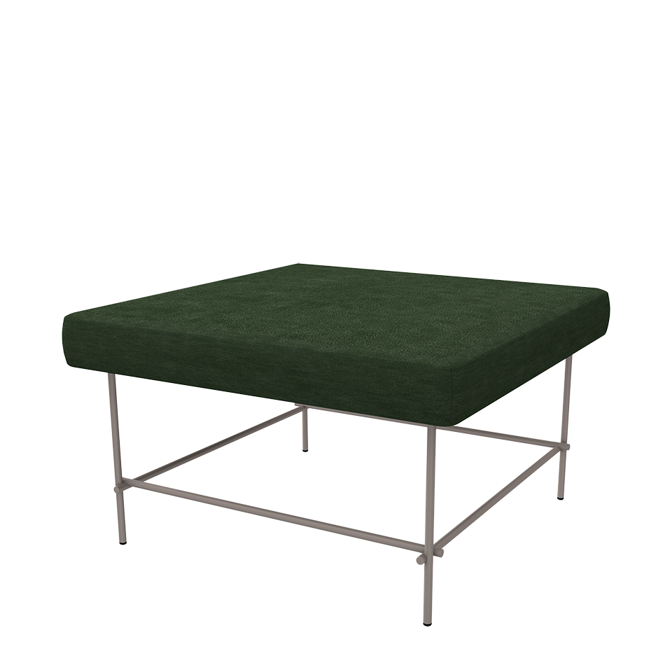 Square ottoman on steel frame with upholstered seat. 80cm / 32″ diameter.