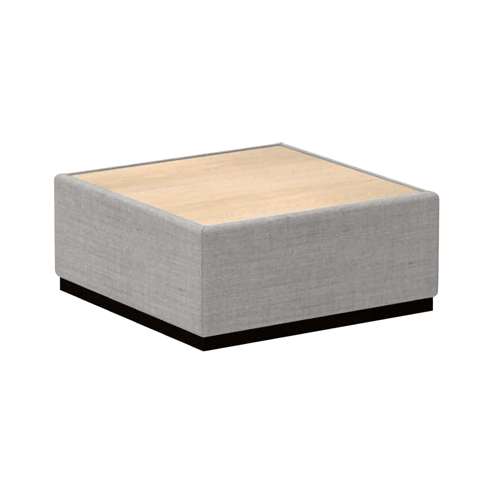 Upholstered modular table measuring 80x80cm with oak tabletop, suitable for lounge areas.