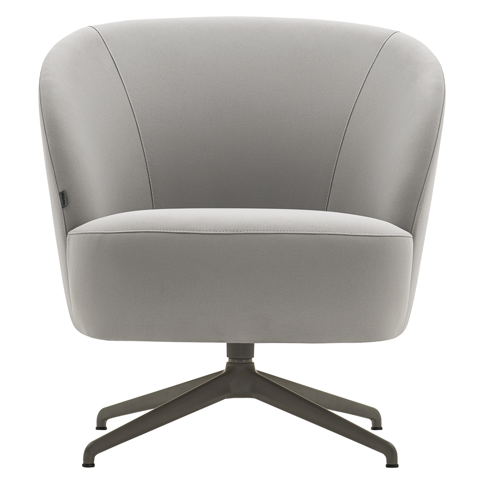 Lounge chair, plywood shell. Upholstered onto the frame. Webbed seat. With 4-spoke aluminum swivel base.