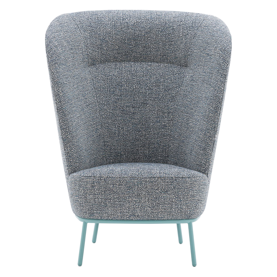 Lounge high-back armchair, plywood beech shell. Webbed seat. Upholstered onto the frame. Metal frame and legs.
