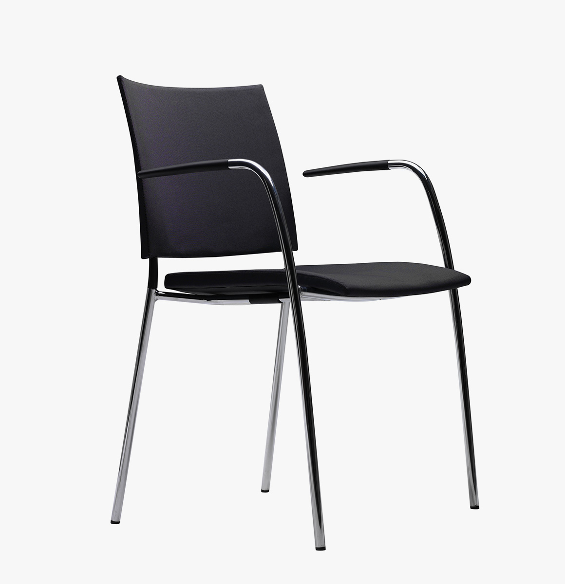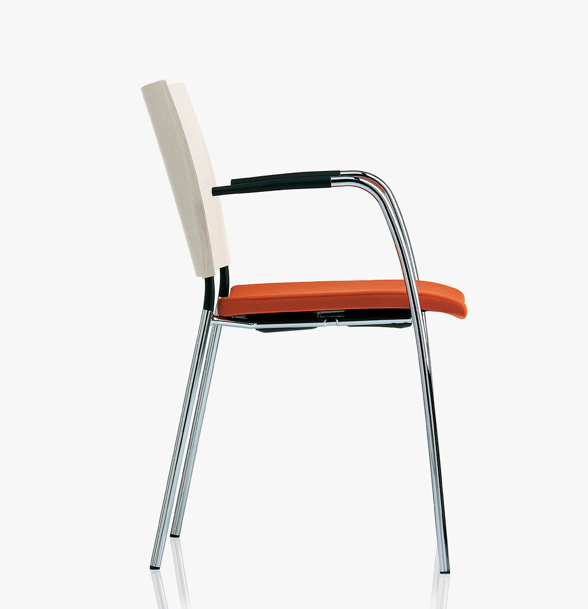 Armchair with upholstered seat and wooden back on a powder coated or chromium plated tubular steel frame. Stackable and linkable