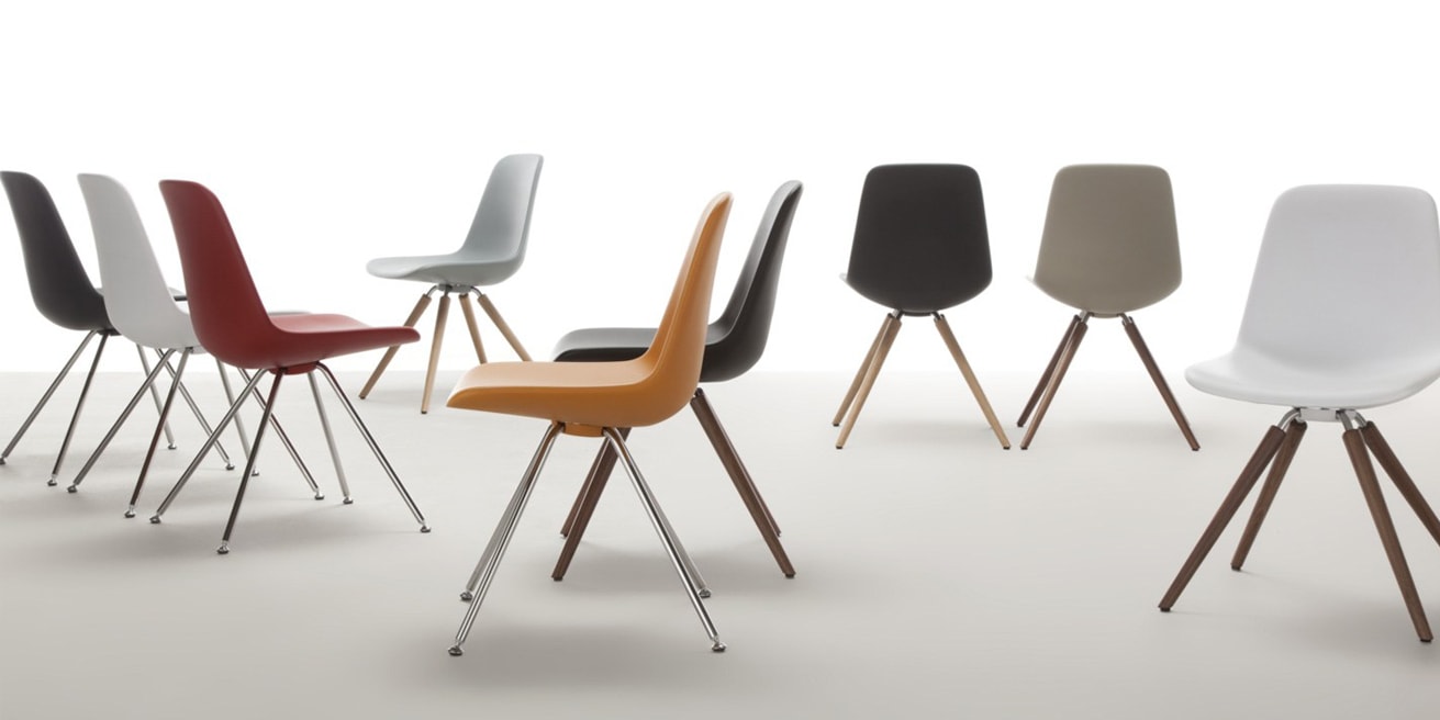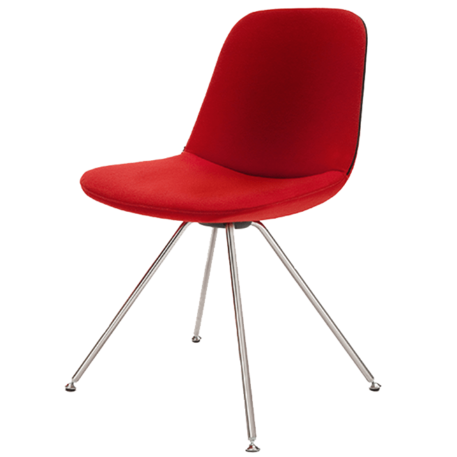 Upholstered side chair. Legs in chrome, matt black or lacquered steel.