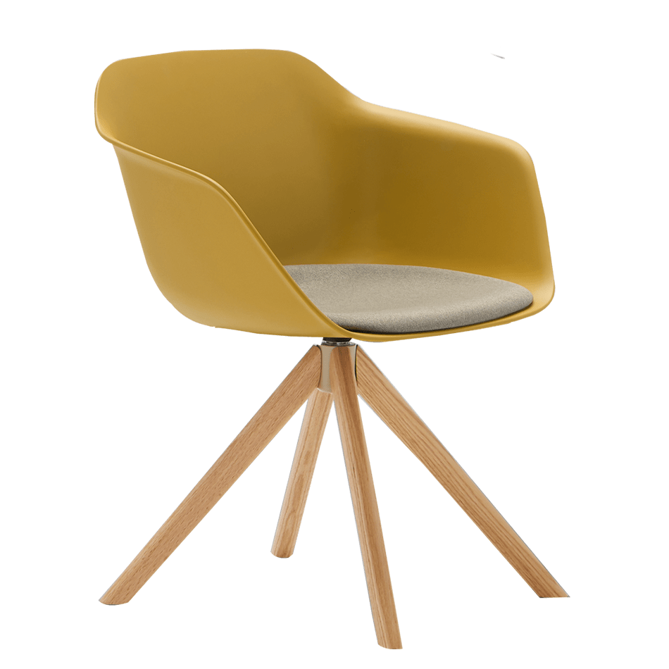 Armchair with a polypropylene shell and upholstered seat on a four star wooden swivel base. Greenguard Certified.