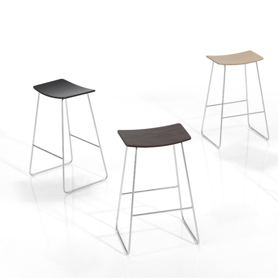 Barstool with steel frame finished in lacquer or chrome, and concave seat in lacquered or stained beech, or solid oak.
